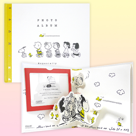 お気に入りの写真を立体的に飛び出すピーナッツの仲間たちと一緒に開いて立てて飾れます。会員番号とお名前の入力だけで簡単応募ができます。注)撮影のため一旦開封をさせて頂いております。